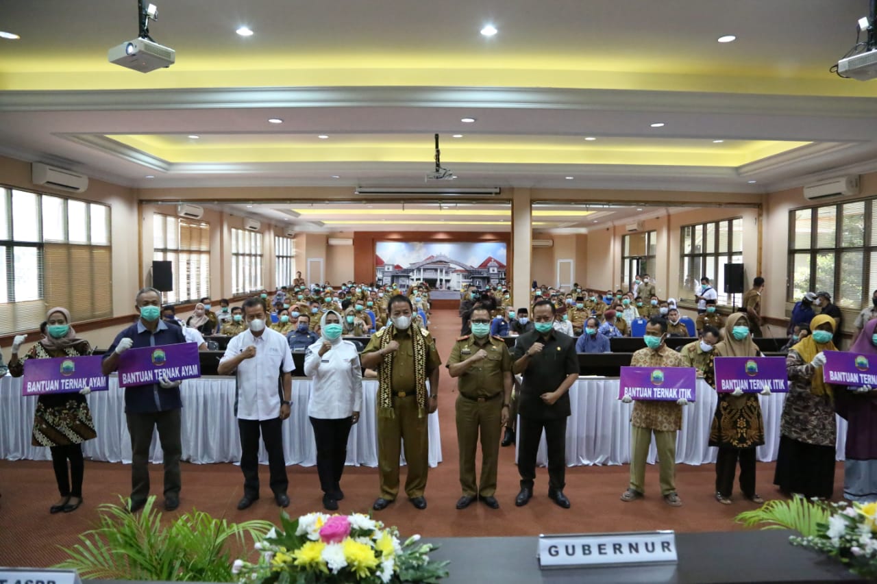 Lamsel- Gubernur Lampung, Ir. H. Arinal Djunaidi secara simbolis menyerahkan bantuan puluhan ribu ternak unggas kepada 280 Kelompok Tani se-Kabupaten Lampung Selatan, di Aula Rajabasa, Kantor Bupati Lampung Selatan.