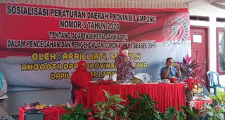 Bandarlampung- Anggota DPRD Provinsi Lampung dapil Bandarlampung Aprilliati, kembali turun ke konstituen dalam rangka melaksanakan Sosialisasi Peraturan Daerah Nomor 3 Tahun 2020 tentang adaptasi kebiasaan baru dalam pencegahan dan pengendalian corona virus disease 2019 atau Covid-19 di Langkapura, Bandar Lampung, Ahad (14/3).