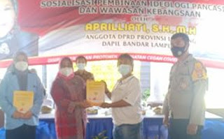 Bandarlampung- Anggota DPRD Provinsi Lampung Aprilliati menggelar sosialisasi pembinaan ideologi dan wawasan kebangsaan bersama mahasiswa-mahasiswi dan masyarakat sekitar Gedung Meneng.
