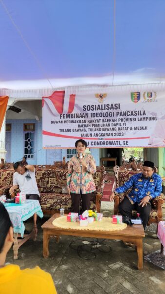 Mesuji — Memupuk persaudaraan antar keluarga, warga masyarakat melalui saling tolong menolong, bergotong royong, dan saling toleransi antar umat beragama merupakan cermin dari pengamalan nilai – nilai Pancasila. Hal tersebut, disampaikan Sekretaris Fraksi PDIP DPRD Provinsi Lampung, Budhi Condrowati. Dihadapan masyarakat Desa Bukoposo, Kecamatan Way Serdang, Kabupaten Mesuji. Sabtu (18/02/2023).