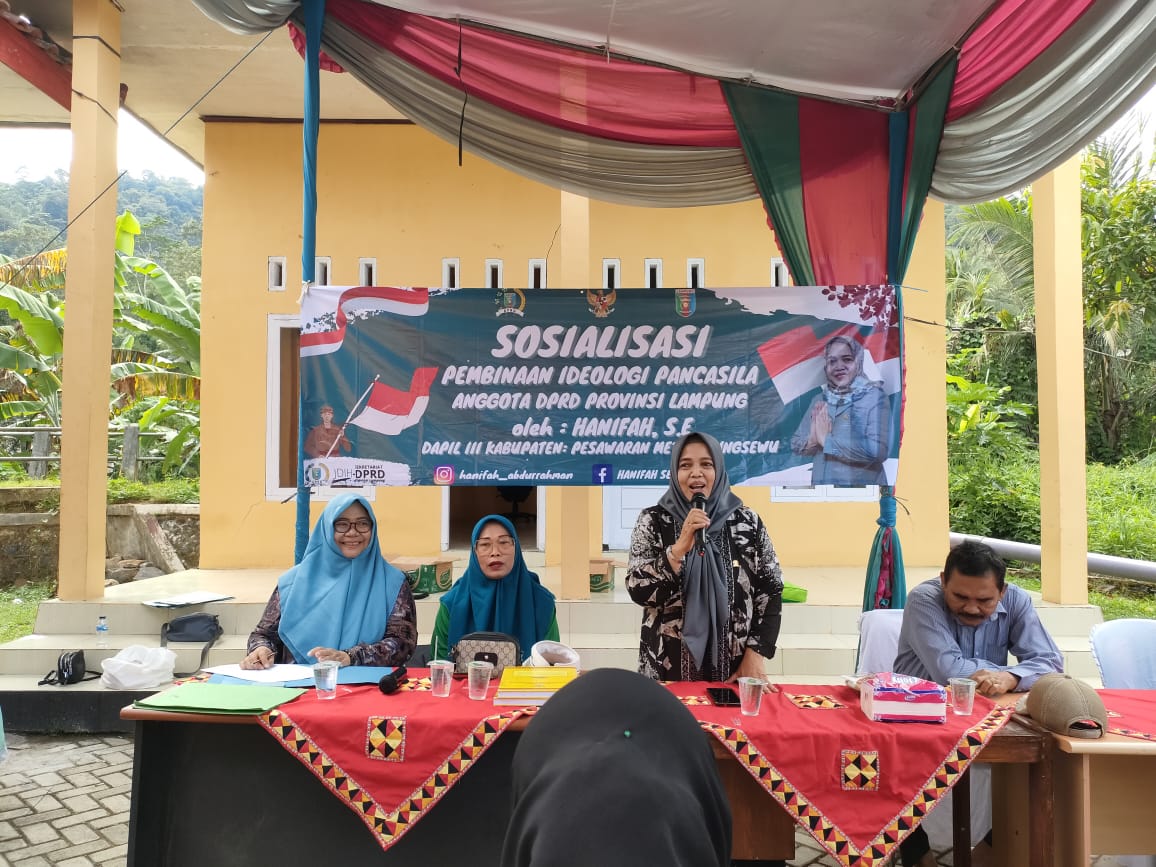 “Pancasila merupakan Ideologi bangsa, sebagai pedoman bagi masyarakat Indonesia dalam menjalankan kehidupannya. Nilai-nilai, yang terkandung dalam kelima asas Pancasila menjadi landasan masyarakat dalam bersosialisasi, kehidupan beragama, hak asasi manusia, dan bekerja sama,” Kata Ketua Fraksi PKB DPRD Lampung, Hanifah, saat menggelar sosialisasi Pembinaan Ideologi Pancasila (PIP), dihadapan masyarakat Desa Khepong Jaya Kecamatan Padang Cermin, Pesawaran. Sabtu (18/02/2023).