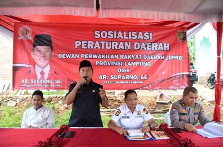 Bandar Lampung — Anggota DPRD Provinsi Lampung Fraksi PDI Perjuangan, AR. SUPARNO, menggelar sosialisasi Peraturan Daerah Nomor 3 tahun 2017, tentang Perlindungan Anak Provinsi Lampung, dihadapan Masyarakat Kelurahan Rajabasa Raya, Kota Bandar Lampung. Sabtu (09/04/2023).