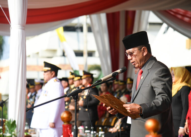 Bandar Lampung – Ketua DPRD Provinsi Lampung Fraksi PDI Perjuangan, Mingrum Gumay, bertugas memimpin Pembacaan Teks Proklamasi saat upacara Hari Ulang Tahun (HUT) Republik Indonesia yang ke-78, di Lapangan Korpri, Bandarlampung, Kamis (17/8/2023).