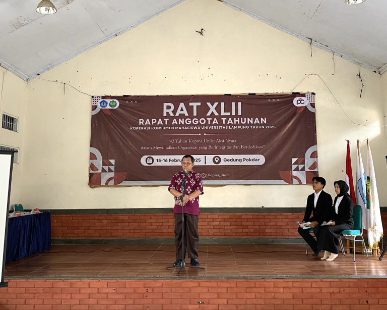 Bandar Lampung – Koperasi Konsumen Mahasiswa (Kopma) Universitas Lampung (Unila) mengadakan Rapat Anggota Tahunan (RAT) dengan mengusung tema, “42 Tahun Kopma Unila: Aksi Nyata dalam Mewujudkan Organisasi yang Berintegritas dan Berdedikasi” pada 15-16 Februari 2025 di Gedung Pokdar Mitra Kamtibmas, Polresta Bandar Lampung.