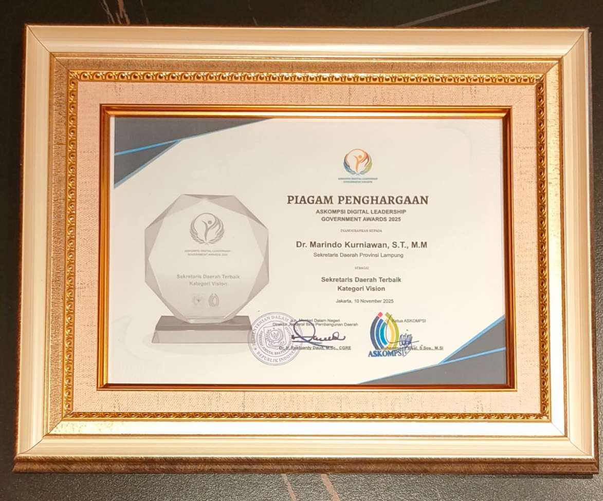 Lampung – Sekretaris Daerah Provinsi Lampung Dr. Marindo Kurniawan, ST, MM mendapatkan predikat sebagai Sekda Terbaik di Seluruh Indonesia.
