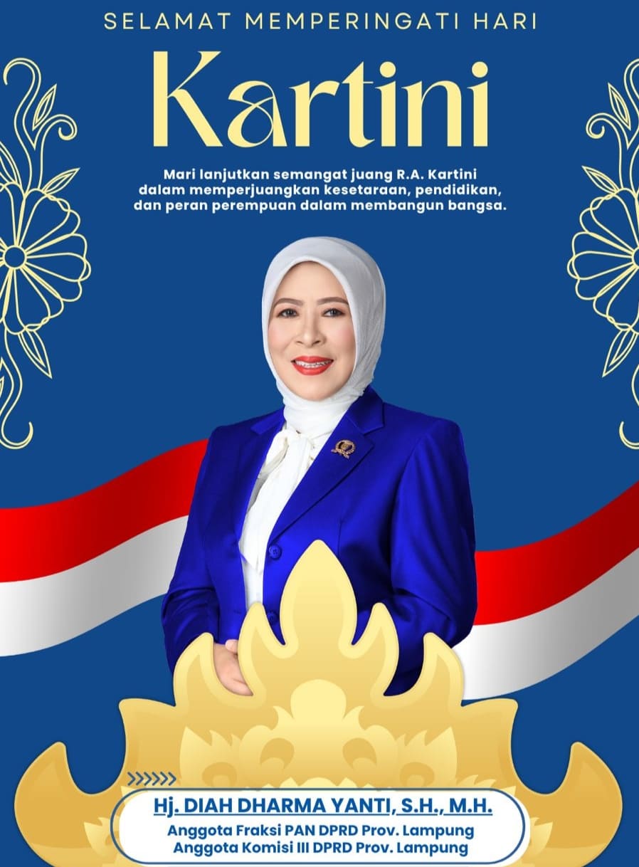 Bandar Lampung — Anggota DPRD Provinsi Lampung dari Komisi III, Hj. Diah Dharma Yanti, S.H., M.H., mengajak seluruh perempuan untuk terus melanjutkan semangat perjuangan R.A. Kartini dalam memperjuangkan kesetaraan, pendidikan, serta peningkatan peran perempuan dalam pembangunan daerah, dalam rangka memperingati Hari Kartini.
